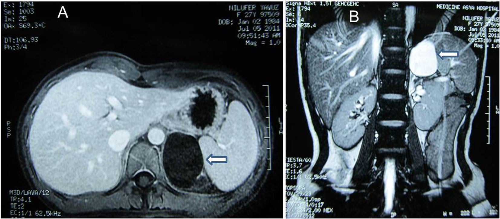 A 27-year-old woman was admitted to the hospital because of a left flank pain. On physical examination, she was normal. Abdominal ultrasonography (USG) revealed a 55 ´ 46 mm cystic mass without any septation or solid component located in the left adrenal space. A laboratory evaluation was done revealing unremarkable values for cortisol (28.12 µg/dL, normal range 5 - 25 µg/dL) and cortisol with 8 mg dexamethasone suppression test (0.35 µg/dL, normal < 3 µg/dL), 24-hour urinary metanephrine (115 µg, normal range 20 - 345 mg) and 24-hour urinary normetanephrine (42.5 µg, normal range 30-440 mg). Magnetic resonance imaging (MRI) of adrenal glands (Fig. 1) was performed demonstrating the 60 mm contrast-enhanced cystic mass in the left adrenal gland.