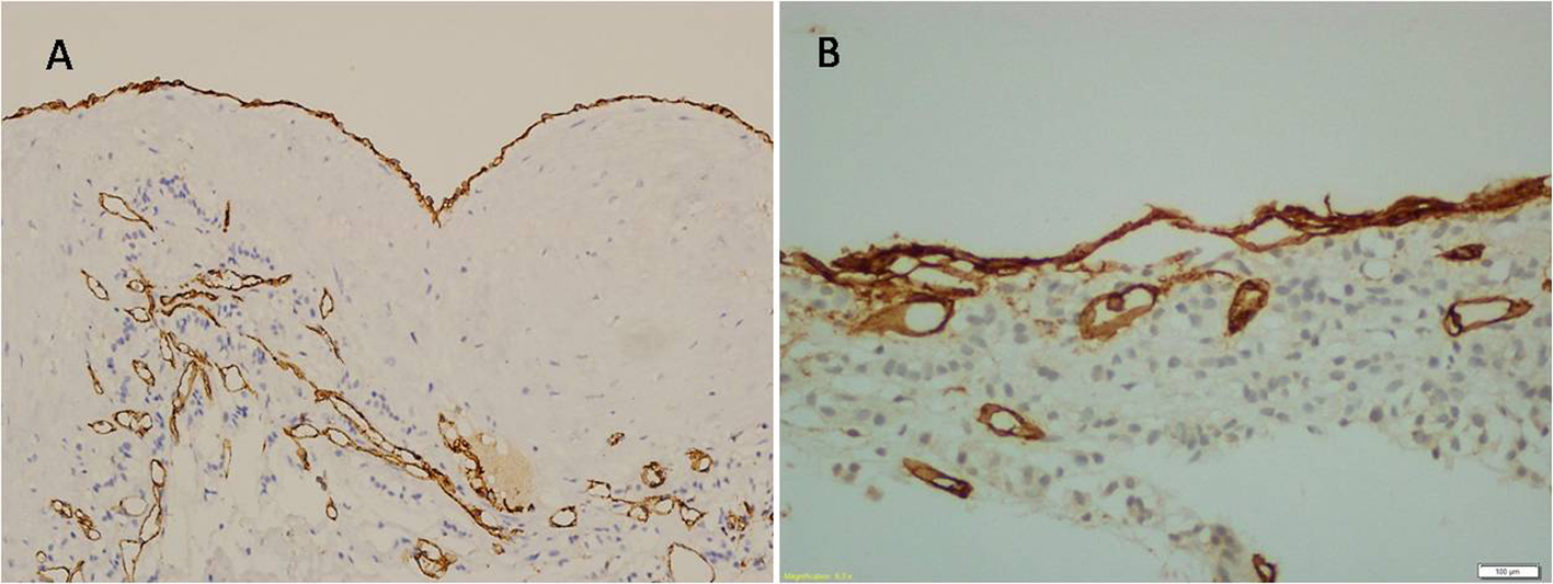 ![]() Click for large image | Figure 3. Flat endothelial cells are positive for D2-40 (A), and positive for CD31 (B). |
