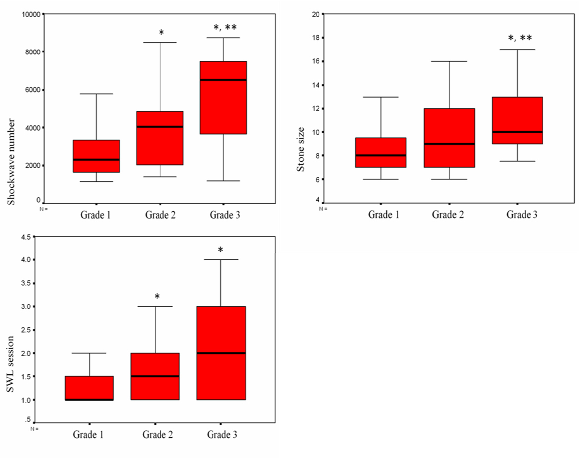 ![]() Click for large image | Figure 1. Shockwave/sessions number and stone size according to of hydronephrotic grades, P < 0.05; *compared to grade 1, **compared to grade 2. |