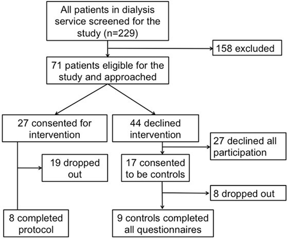 Of 229 patients screened for eligibility (Fig. 1), 71 (31%) were found eligible. Most patients were excluded because they had not been dialyzing for the stipulated 12 months, could not converse in English or had a co-existing psychiatric illness requiring specialist care. Twenty-seven patients gave informed consent to participate in the intervention arm. Of the remaining 44 patients, 17 agreed to participate in the control arm. Nineteen (70%) participants from the intervention arm dropped out of the study. Most dropouts occurred within the first 3 months. Their reasons included inability or unwillingness to meet the time commitment (n = 7), finding psychological intervention unhelpful (n = 4), physical illness requiring extended hospitalization (n = 2), group dissolution (n = 2), post dialysis fatigue (n = 1), transplantation (n = 1), migration (n=1) and death (n = 2).