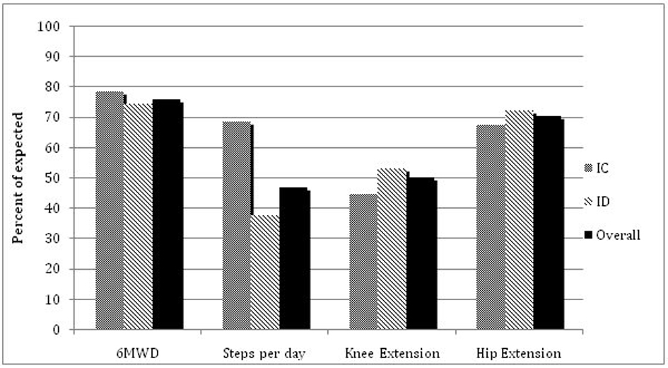 Participants were markedly sedentary, spending on average of 20 h per day lying or sitting. The number of steps walked per day was well below the recommended 10,000. Steps taken were numerically higher in IC participants, but observed differences did not reach statistical significance. Muscle strength was markedly reduced in the study cohort when compared to an age and sex matched healthy cohort [17], on average 45% of expected in healthy subjects for knee extension and 70% for hip extension, respectively. There was no difference in baseline muscle strength between the IC and ID group. Figure 2 illustrates the marked differences in the selected baseline physical parameters against the normal population.