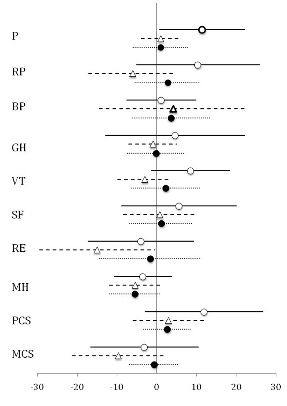![]() Click for large image | Figure 3. Mean change in SF-36 scores between baseline and the end of study. A positive value indicates an improvement at the end of study. The horizontal lines indicate the 95% confidence intervals. IC: white circle; ID: white triangle; CO: black circles. |