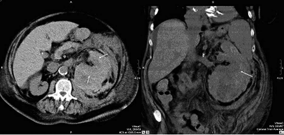 Due to hemodynamic instability coupled with decrease of the haemoglobin value, the third plasma exchange was interrupted prematurely and CT scan was initiated, which revealed an extended inhomogeneous mass around the left kidney which pointed at a combination of parenchymal and subcapsular bleedings. There was also free fluid beneath the spleen and in the lower abdomen (Fig. 1).