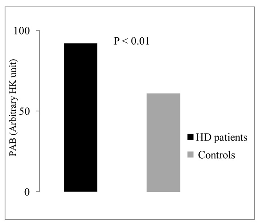 Conclusion: Since little data exits on the PAB assay in the HD patients, the high values of PAB indicated in our study need to be confirmed by further studies.