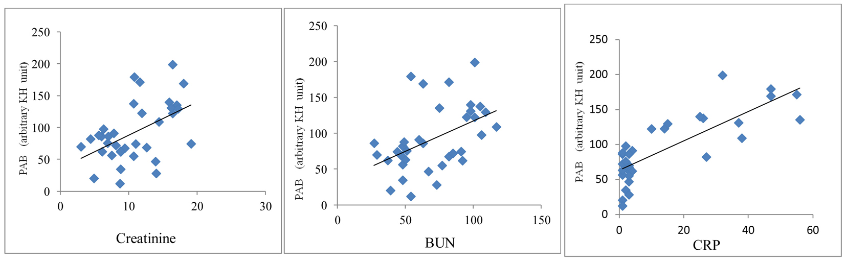 ![]() Click for large image | Figure 2. Correlation between PAB values and serum creatinine, BUN and CRP in HD patients. |