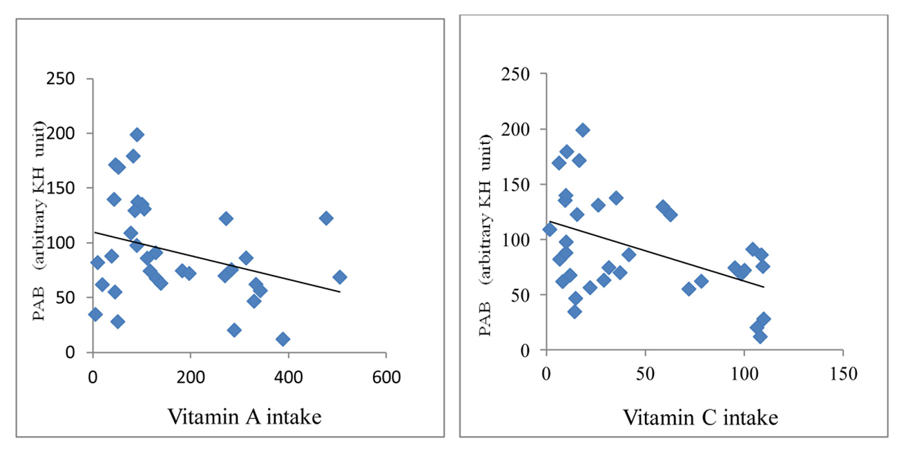 ![]() Click for large image | Figure 3. Correlation between PAB and vitamins A and C in HD patients. |