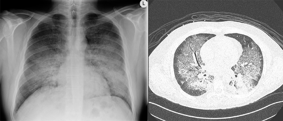 ![]() Click for large image | Figure 1. Chest X-ray and computed tomography of the chest demonstrating ground glass opacities consistent with diffuse alveolar hemorrhage in anti-glomerular basement membrane antibody disease. |