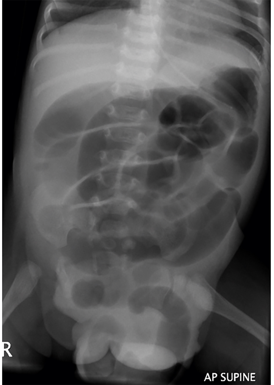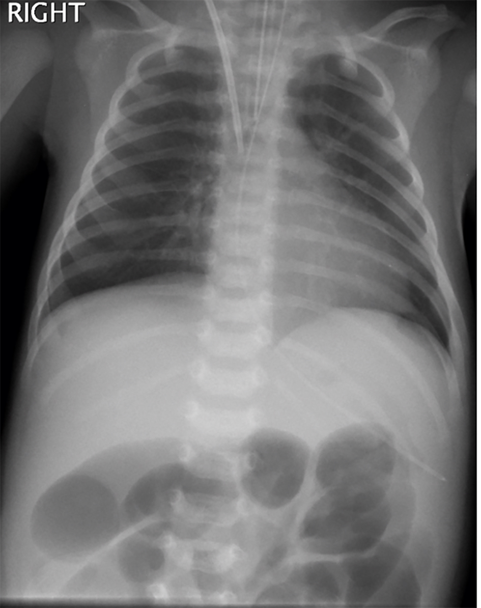 Chest radiograph showed clear lung fields (Fig. 1). Abdominal radiograph showed dilated bowel loops (Fig. 2). There were no signs of sepsis on chest radiograph and NEC on abdominal radiograph. As she continued to deteriorate, she was referred to and transferred to us on the third day of admission for small bowel obstruction with bowel ischemia.