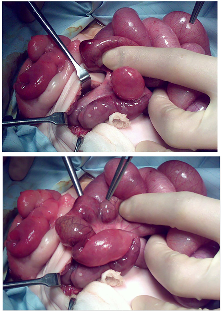 ![]() Click for large image | Figure 3. Findings and operative procedures. Note the ileo-ileal intussusception and prolapsed discoloured ileo-exstrophy. |