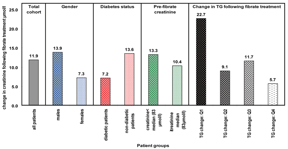 Conclusions: This study confirms that creatinine increased in our group of patients when fibrates were commenced. Further studies are required to confirm and further explore our findings.