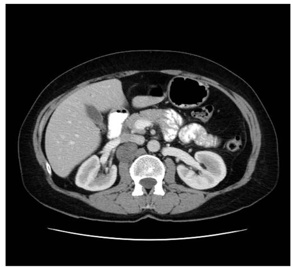 ![]() Click for large image | Figure 2. Abdominal CT showing an adrenal lesion. |