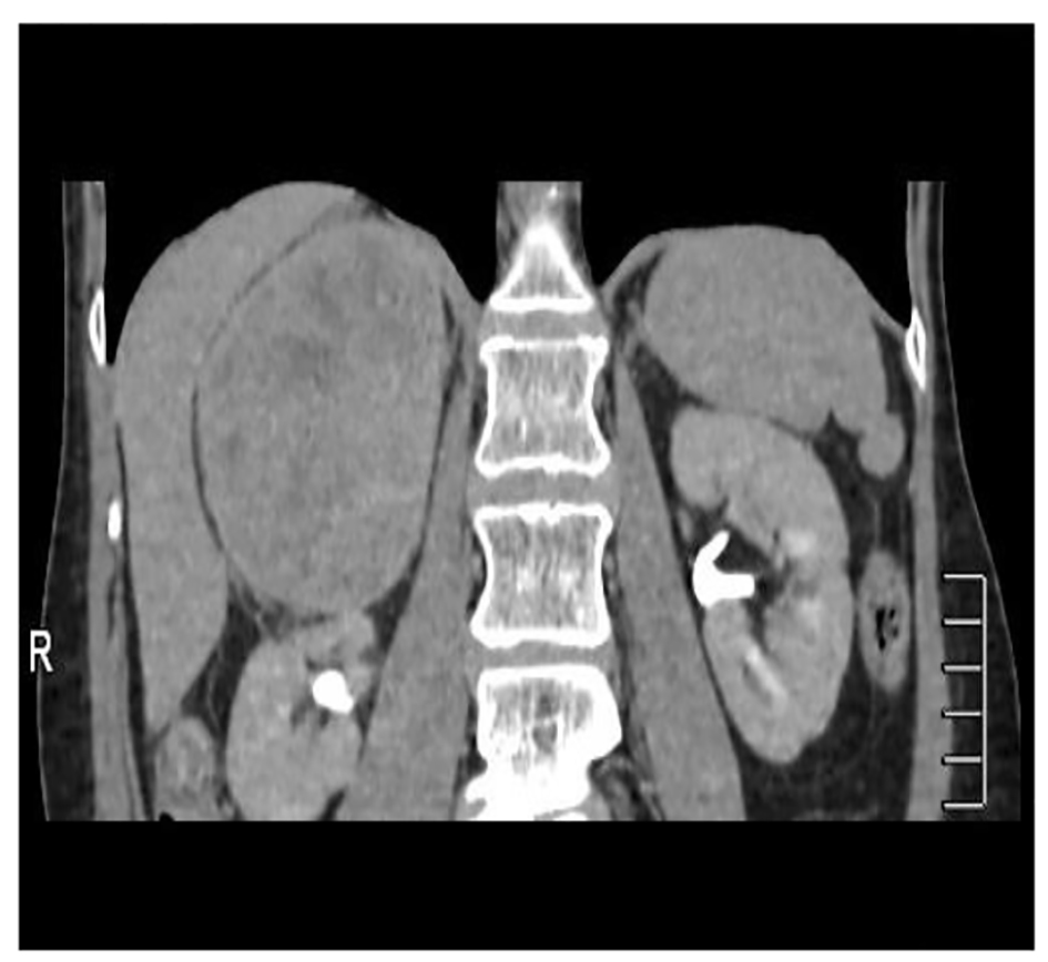 ![]() Click for large image | Figure 1. Abdominal CT showing a tumor occupying the retroperitoneal space. |
