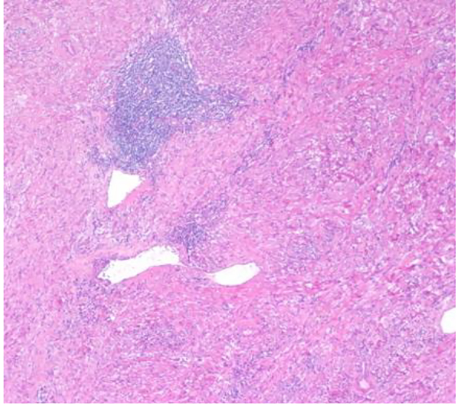 ![]() Click for large image | Figure 4. Hematoxylin-eosin stain: dense spindle cell proliferation with presence of vascular formations and lymphocytic infiltrates (× 100). |