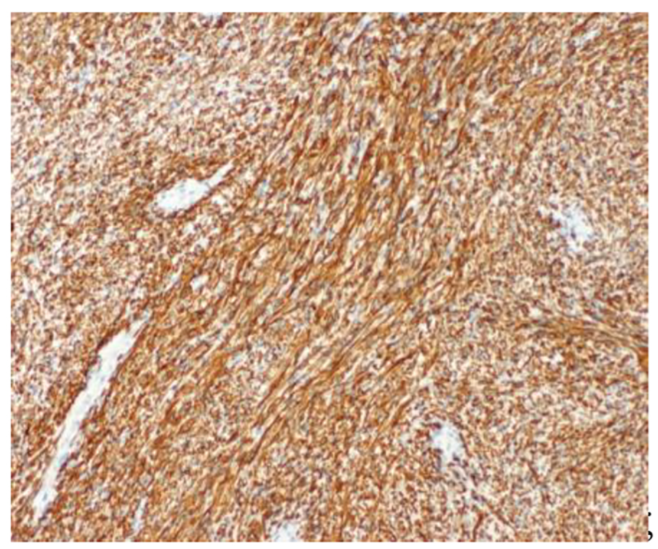 The patient underwent a right adrenalectomy laparoscopic surgery. Pathological evaluation revealed an adrenal schwannoma. Macroscopically tumor was well-circumscribed and encapsulated. The tumor measured 10 × 9.5 × 6 cm and weighed 427 g (Fig. 3). Histopathological findings showed regular fusiform cells, without atypia or mitosis and fibrillar cytoplasm. Intersecting cells were surrounded by histiocytes. Also there was collagen area which was stained with Masson’s trichrome (Fig. 4). Tumor cells expressed S-100 (Fig. 5), IV collagen, vimentin and GFAP. The desmin and c-kit were negative. Ki67 activity was 30%.