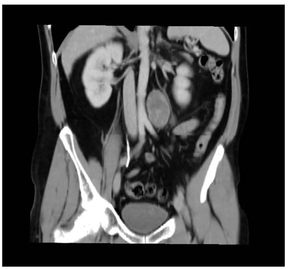 ![]() Click for large image | Figure 6. Abdominal CT scan showing the retroperitoneal lesion. |