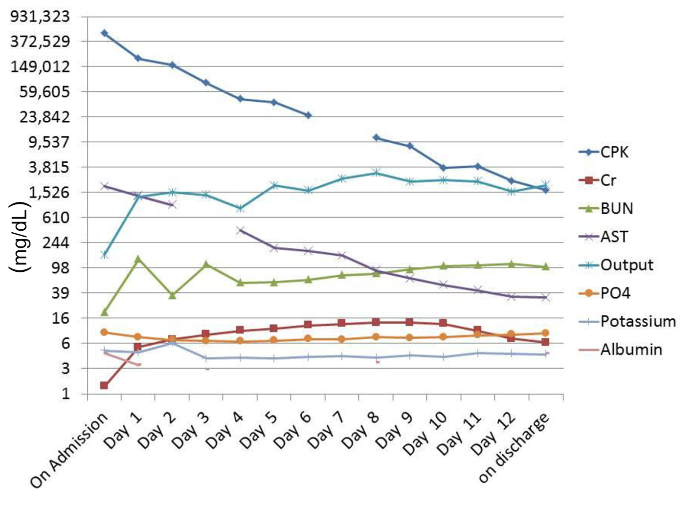 His initial set of ER lab showed an elevated hemoglobin of 16.7 g/dL with a white cell count of 13,440/mm3. The CK level on admission was about 510,924 IU/L. Creatinine (Cr) was 1.33 mg/dL with blood urea nitrogen (BUN) of 20 mg/dL, AST was 1,951 IU/L, ALT was 381 IU/L, anion gap was 11.0 mEq/L, albumin was 4.5 g/dL, and inorganic phosphate was 5 mg/dL. His urine analysis showed specific gravity > 1.030 and protein > 300 mg/dL, blood and bilirubin was detected as high, and nitrite was positive with moderate leukocytes. RBCs casts were present with mucous threads and the urine myogloblin level > 12,700 μg/L (reference range: < 28 μg/L). Drug screen turned out to be negative.