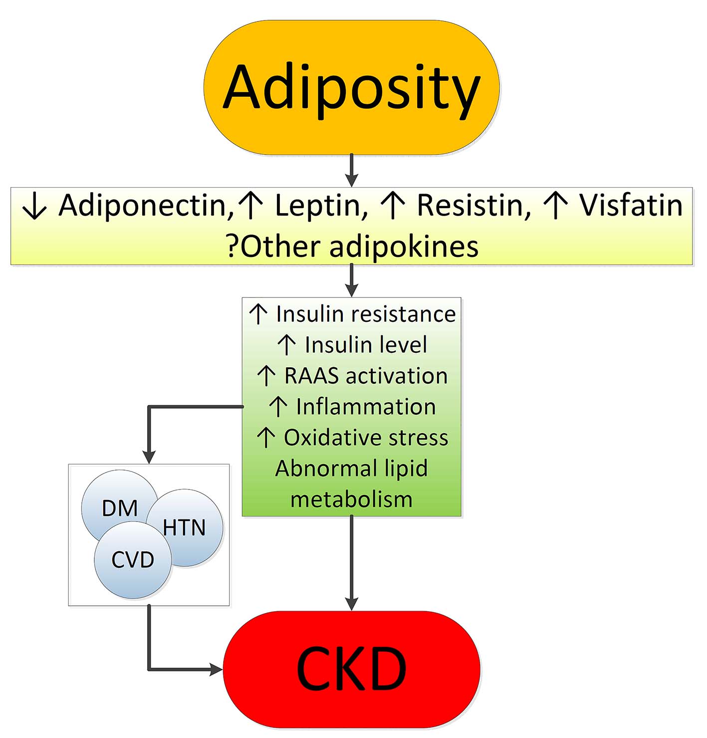 Higher visceral adipose tissue measured by computed tomography has been associated with a higher prevalence of albuminuria in men [22]. The observation of a BMI-independent association between abdominal obesity and poorer renal outcomes is also described in relationship with mortality in patients with ESRD [23] and kidney transplant [24], and suggests a direct role of visceral adiposity. In general, the associations between obesity and poorer renal outcomes persist even after adjustments for possible mediators of obesity’s cardiovascular and metabolic effects, such as high blood pressure and diabetes mellitus, suggesting that obesity may affect kidney function through mechanisms in part unrelated to these complications (vide infra).