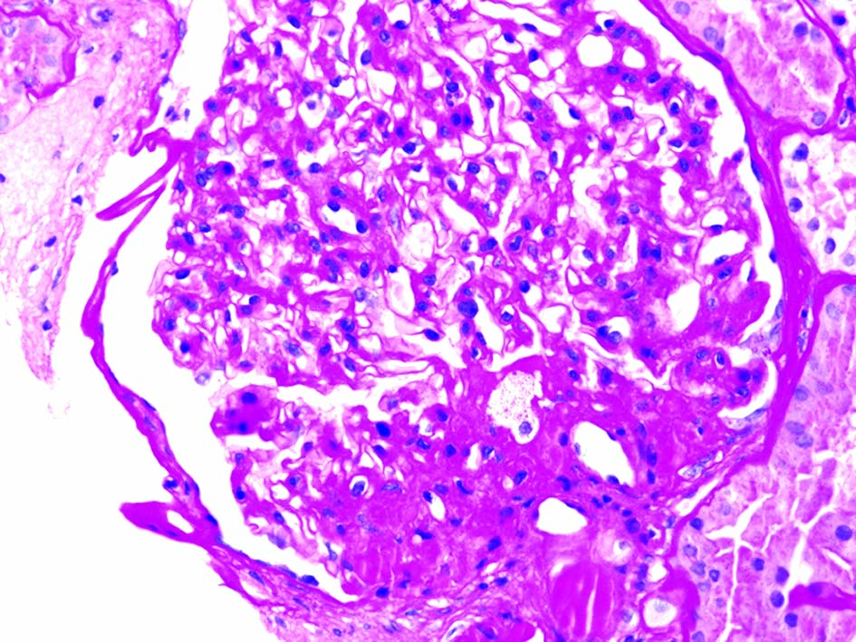 ![]() Click for large image | Figure 2. Obesity-related perihilar focal segmental glomerulosclerosis on a background of glomerulomegaly (periodic acid-Schiff stain, original magnification, × 400). Courtesy of Dr. Patrick D. Walker, MD; Arkana Laboratories, Little Rock, AR. |