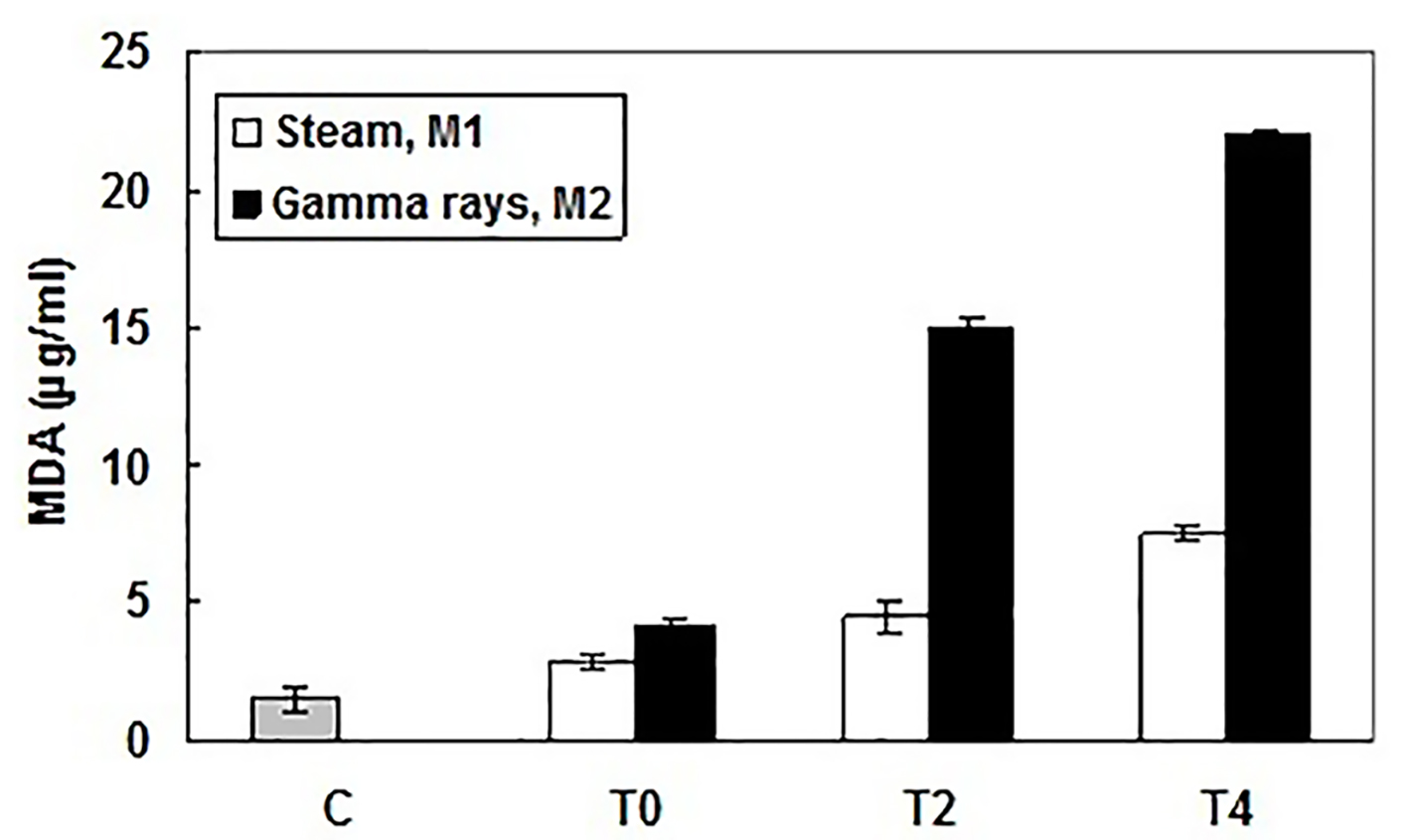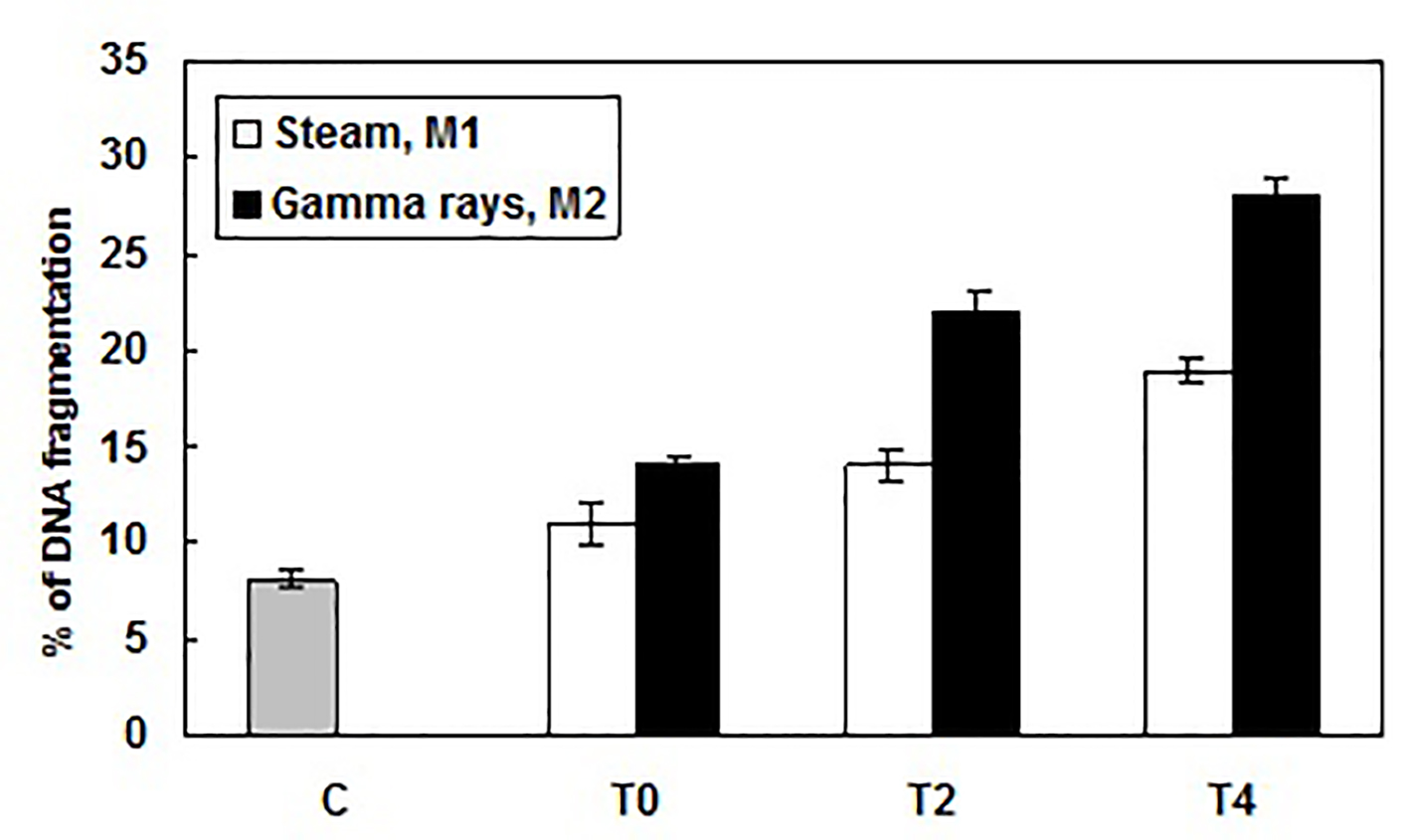 Slight DNA fragmentation was observed with dialyzer sterilized by steam (M1). The DNA fragmentation profile was more pronounced with dialyzer sterilized by gamma rays (M2). DNA fragments (DNA ladders) showing varying sizes between 750 and 2,000 base pairs were clearly visible after agarose gel electrophoresis, but no specific DNA fragments were detected when controls were analyzed (Fig. 2). Using a quantitative analysis of DNA fragmentation, a significant effect was observed after peripheral blood leucocytes exposure to different sterilized dialyzer membranes. This DNA fragmented level reached at the end of HD session 19±0.624% and 28±0.975%, respectively for steam sterilized M1 and gamma rays-sterilized M2 (Fig. 3). However, these genotoxic effects should be consequences of oxidative injury. Our finding is in concordance with other data that report a significant DNA fragmentation level in HD patient lymphocytes [13, 14].