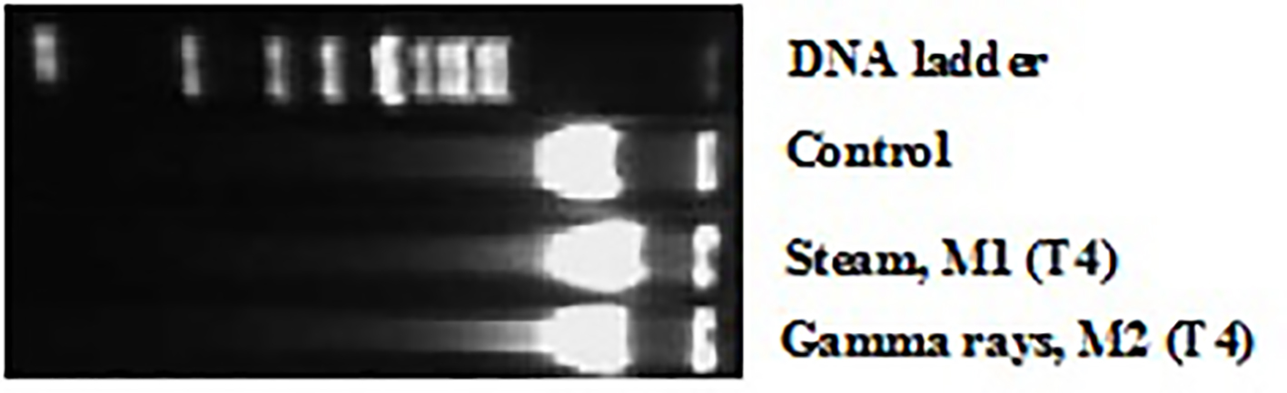 ![]() Click for large image | Figure 2. DNA fragmentation induced by exposure to different dialyzer membranes sterilization mode: M1 (sterilized by steam) and M2 (sterilized by gamma rays), in patient leucocytes at the end (after 4 h, T4) of HD session and revealed by agarose gel electrophoresis. |