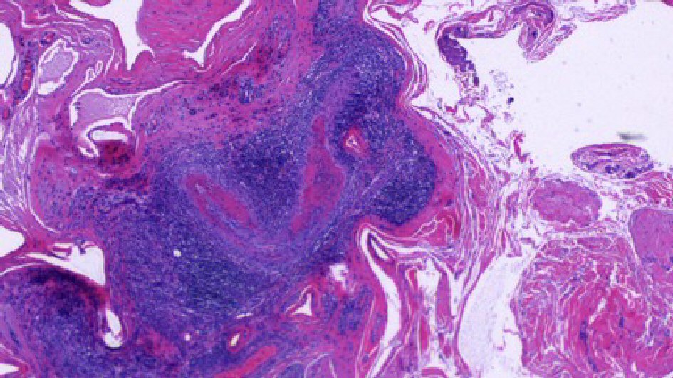 ![]() Click for large image | Figure 2. Left paratesticular tissue with focal necrotizing vasculitis of small and medium sized vessels and perivascular infiltrates containing of lymphocytes and plasma cells (H&E, 40 × original magnification). |