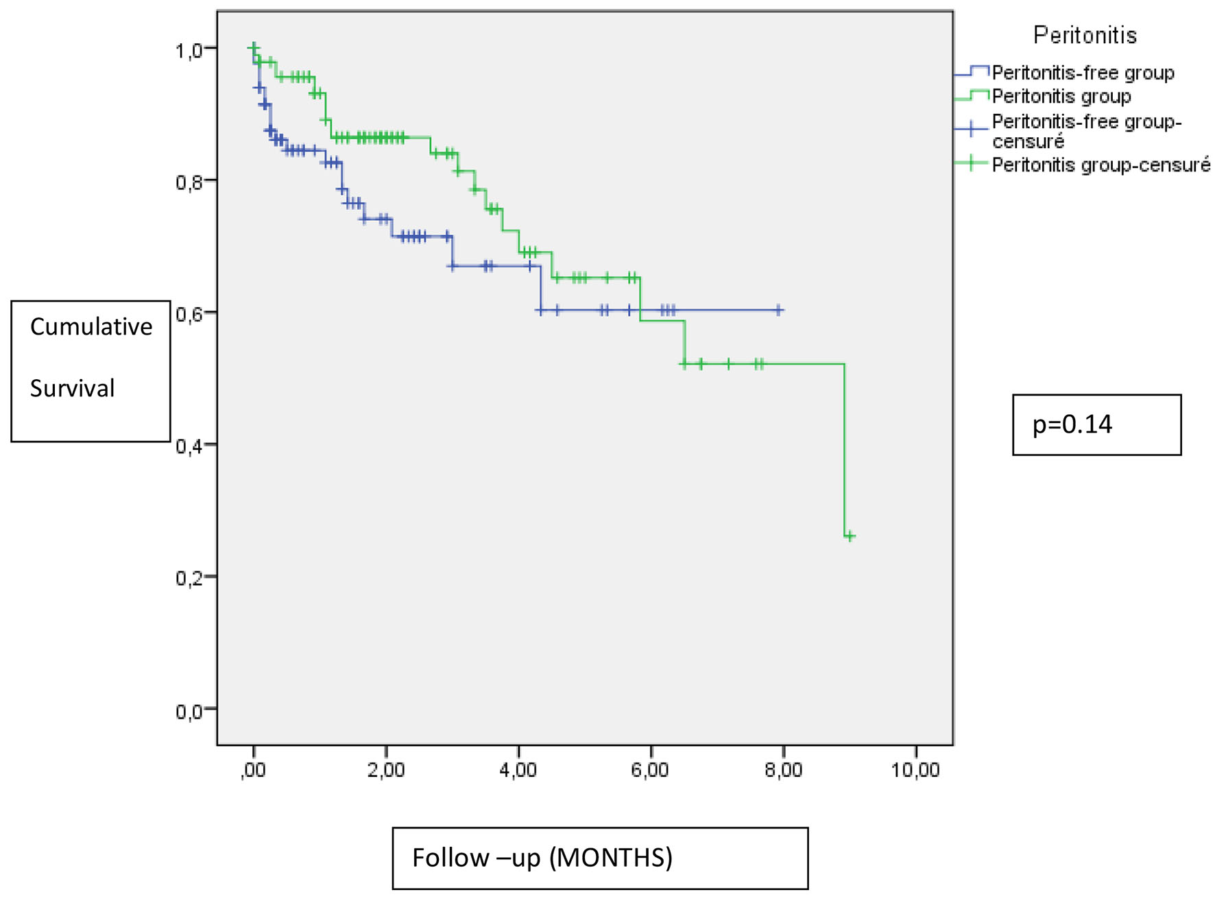 In the Kaplan-Meier analysis, there was no difference in patient survival between peritonitis group and peritonitis-free group (Fig. 3).