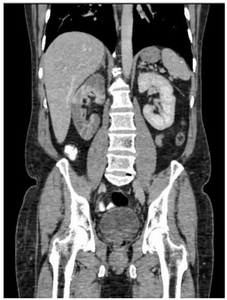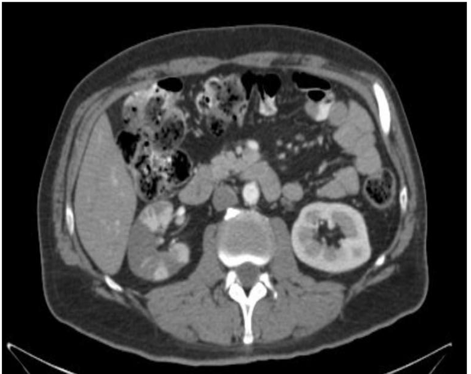 A 56-year-old man with medical history of hypertension and diabetes mellitus presented to emergency department with complaint of sudden onset of severe right lower abdominal pain for 1 day. History was negative for urinary symptoms, constipation or diarrhea, trauma to abdomen or alcohol abuse. Three weeks prior, he was admitted in intensive care unit for suicidal attempt with acetaminophen overdose. History was negative for fever, chills, joint pain, rashes or kidney stones. Vital signs in emergency department showed BP 145/74, HR 87/min, RR 16/min, and temperature 36.3 °C. Systemic examination was positive for mild tenderness at right lower abdomen and severe tenderness at right costovertebral angle. Chest exam was normal, cardiovascular exam revealed systolic murmur at the mitral area and patient said he was told to have murmur in the past. Initial lab tests revealed WBC 16,650, Hb 14.4 g/dL, and platelet 432,000. Urinalysis showed WBC 6 - 10, RBC 3 - 5, negative leukocyte esterase and nitrite. Liver function showed ALT 77, AST 116, LD 1,051 with normal bilirubin, albumin and INR. Liver function was probably deranged from recovering liver injury from acetaminophen overdose but LD was disproportionately high. Urine drug screen was negative. CT scan of abdomen with contrast showed striated appearance of the right kidney with hypoperfusion and wedge-shaped hypodensities throughout the kidney (Figs. 1 and 2). Given radiographic appearance, acute onset, and evidence of leukocytosis, pyelonephritis versus multifocal infarction were suspected. He was started on antibiotics for pyelonephritis. But the clinical picture was more favorable for kidney infarction due to absence of fever, urinary symptoms and normal urinalysis. Urine culture showed mixed flora. Ultrasound with Doppler study showed relative decrease in blood flow within the right peripheral renal cortex compared to the left and the study was negative for renal artery stenosis. Lactate dehydrogenase was elevated to 1,051 at admission, peaked at 2,049 and decreased to 733 at the time of discharge. Due to disproportionate rise of lactate dehydrogenase, renal infarct was the more likely cause. Electrocardiogram showed normal sinus rhythm with no evidence of atrial fibrillation. The patient developed fever during hospital stay and blood culture was positive for methicillin sensitive Staphylococcus auricularis. Transthoracic echocardiogram was normal, but due to persistent fever, transesophageal echocardiogram was done that showed no vegetation and showed trivial mitral and tricuspid regurgitation with normal left ventricular ejection fraction.