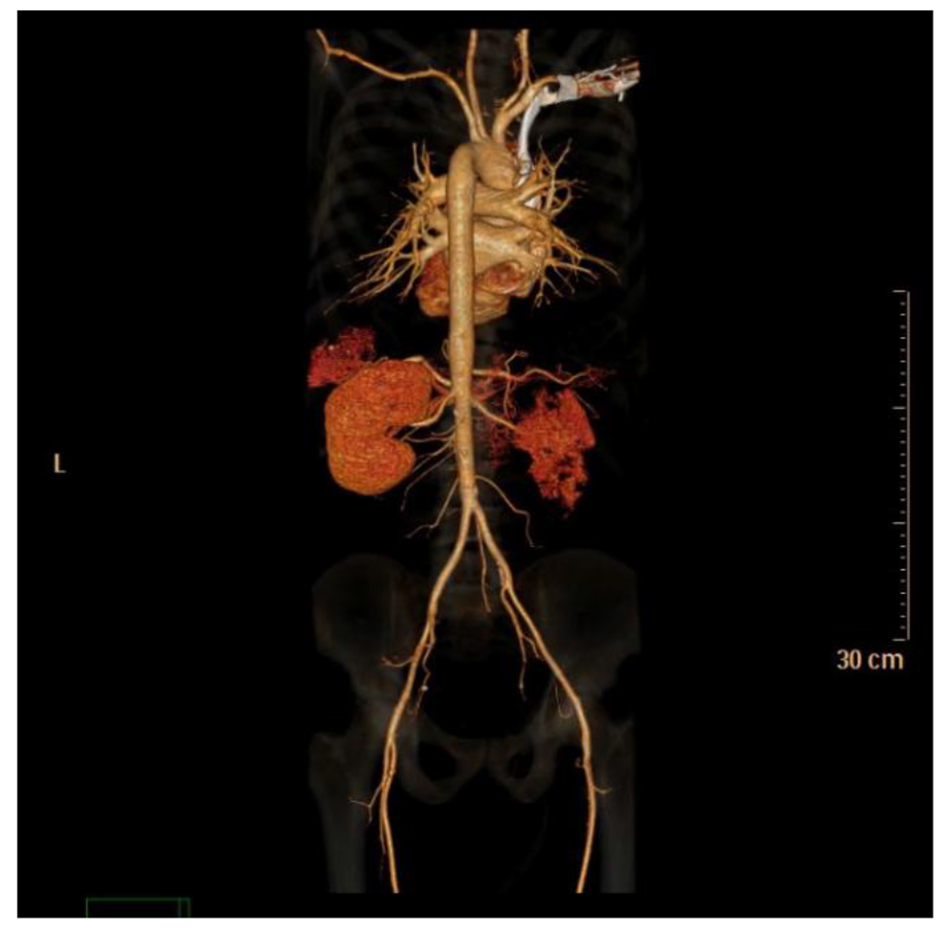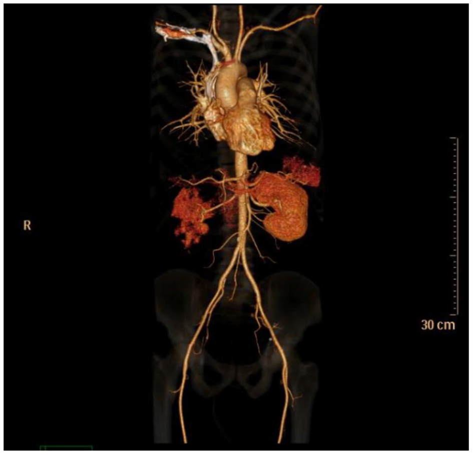 Lab tests were negative for antinuclear antibody, antinuclear cytoplasmic antibody, hepatitis B, hepatitis C and HIV. CT angiogram showed normal aorta, normal main renal arteries without evidence of dissection, luminal irregularity, or ostial stenosis (Figs. 3 and 4). Hypercoagulable study was negative for Lupus anticoagulant panel, antithrombin III deficiency, protein C and protein S deficiency and factor V Leiden mutation. After extensive workup, no apparent cause of renal infarct was found. Due to absence of underlying cause of atrial fibrillation or hypercoagulable disorder, no anticoagulation was started and he was discharged home on aspirin.