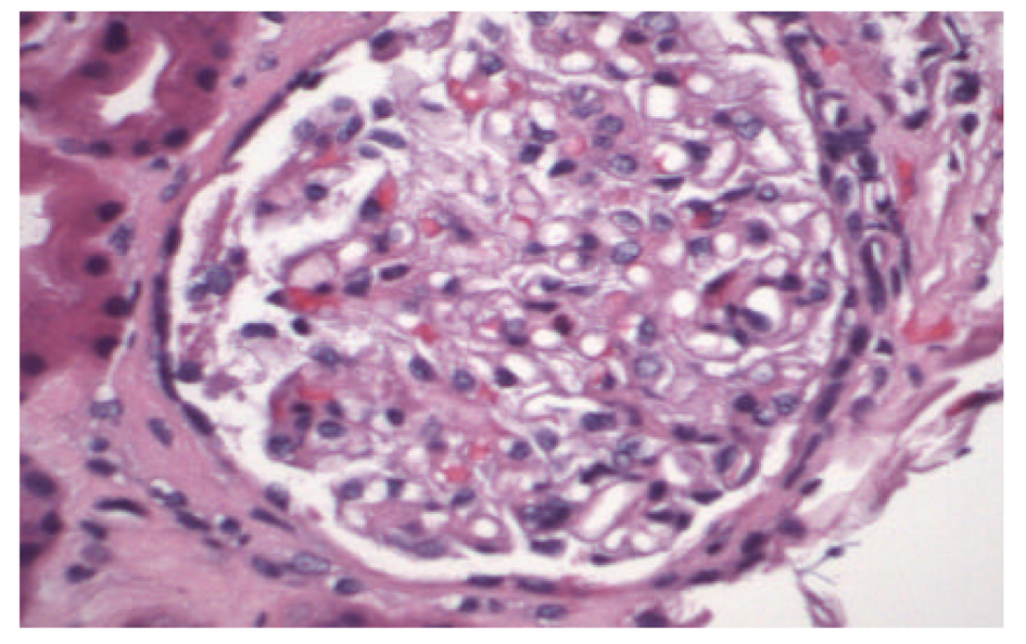 ![]() Click for large image | Figure 1. Mild mesangial matrix expansion, otherwise normal glomerulus (Hematoxylin & Eosin, × 4,000). |