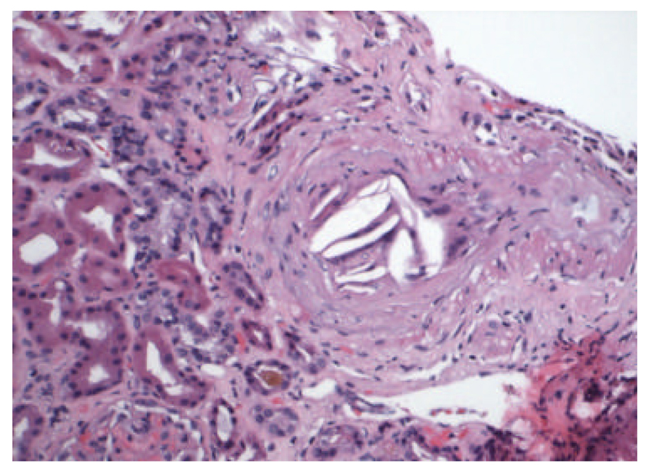 Renal ultrasound showed normal size kidneys with bilateral cortical thinning, and no hydronephrosis. CT scan of the abdomen and pelvis showed a 3.2 cm infrarenal abdominal aortic aneurysm with mural thrombus of undetermined age. Patient was started on dialysis and a percutaneous renal biopsy was performed. The biopsy specimen revealed that 8 out of 26 glomeruli were globally sclerotic and the remaining glomeruli showed diffuse mesangial matrix expansion and focal patchy interstitial fibrosis (Fig. 1). The medium sized arteries were focally occluded by cholesterol clefts surrounded by granulomatous inflammation, and small arterioles with severe arteriolonephrosclerosis, without evidence of vasculitis (Fig. 2, 3). The patient was discharged home with outpatient dialysis arrangements, and he has remained dialysis dependent.