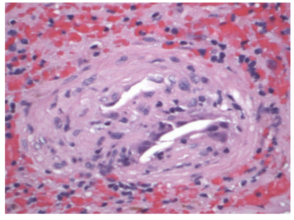 ![]() Click for large image | Figure 2. Medium sized artery with focal occlusion by cholesterol clefts, surrounded by granulomatous inflammation (Hematoxylin & Eosin, × 2,000). |