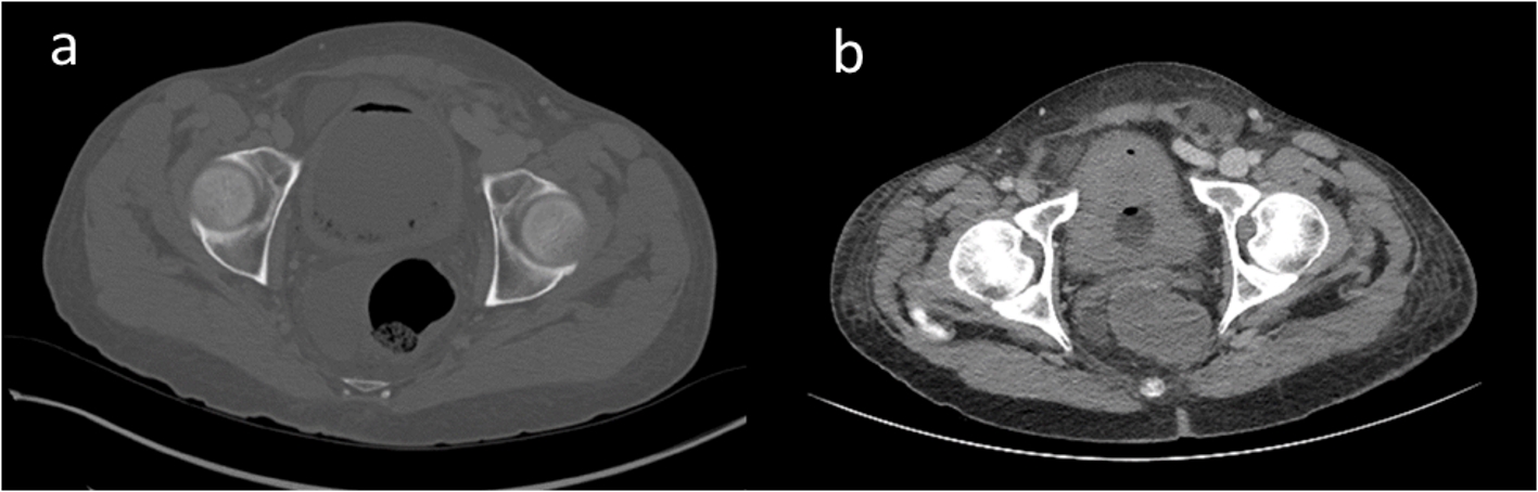![]() Click for large image | Figure 1. Computed tomography at admission showed multiple non-dependent gas foci within the thickened bladder wall suggestive of emphysematous cystitis (a) which was markedly improved following catheter decompression and antibiotic therapy (b). |