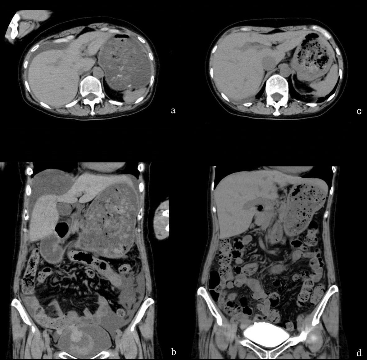 A 58-year-old woman fell on the way home after drinking alcohol for 5 h, and presented to the emergency room (ER) with lower abdominal pain and urinary retention. On examination, she was afebrile (35.0 °C), with a blood pressure of 96/68 mm Hg and a pulse rate of 52 beats per minute (BPM). Oxygen saturation was 94% in room air. Laboratory tests revealed a white blood cell (WBC) count of 14,940/mm3, hemoglobin 13.2 g/dL, serum C-reactive protein (CRP) 0.05 mg/dL, blood urea nitrogen (BUN) 30.0 mg/dL, serum creatinine 1.88 mg/dL, and gross hematuria. Non-contrast abdominopelvic computed tomography (CT) revealed a large amount of ascites (Fig. 1a) and fresh blood clots in an intra-distended bladder (Fig. 1b). Based on these findings, she was diagnosed with post-renal renal failure due to urinary retention, bladder tamponade due to bladder cancer hemorrhage, and ascites due to cancerous peritonitis.