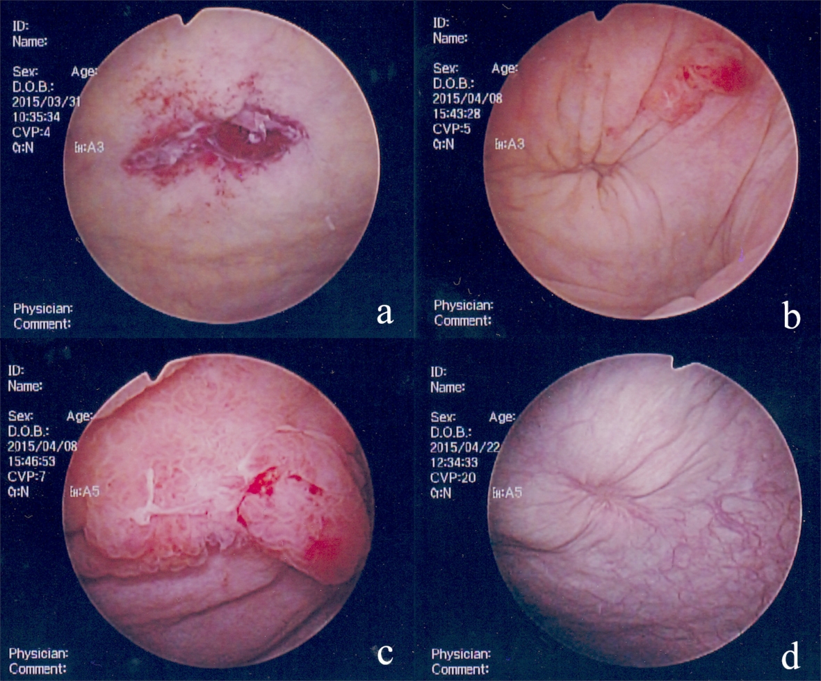 ![]() Click for large image | Figure 2. Findings from cystoscopy. (a) A small tear with blood clots at the bladder dome at 3 days after admission. (b) An obstructed tear and a papillary tumor on the left side of the tear at 11 days after admission. (c) An enlarged papillary tumor at 11 days after admission. (d) Healed bladder rupture at 11 days after discharge. |