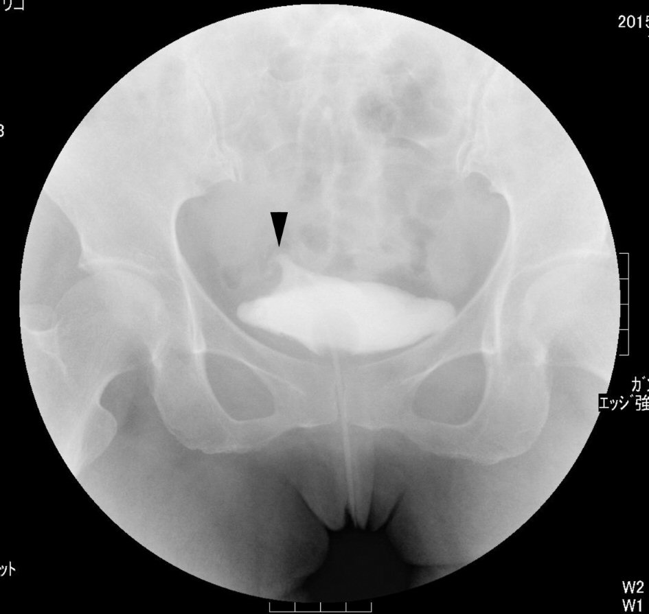 ![]() Click for large image | Figure 3. A conventional cystogram showed extravasation of contrast agent from the bladder dome (arrowhead) at 5 days after admission. |
