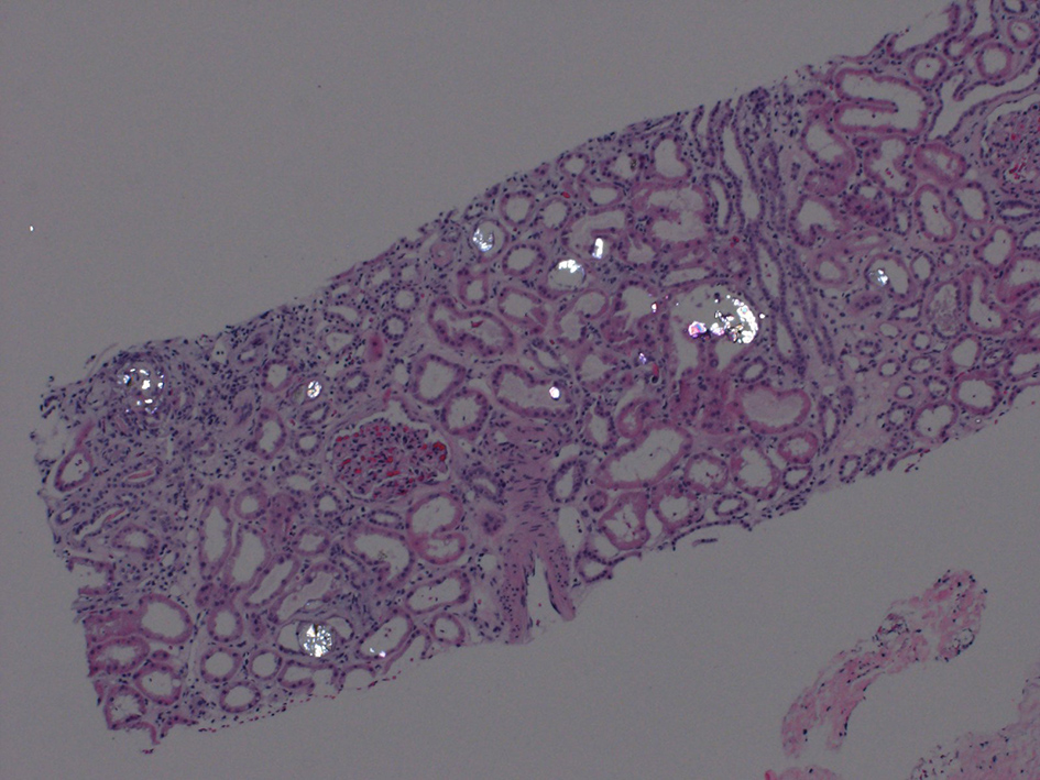 After several days of care and an unremarkable renal ultrasound, a renal biopsy was ordered. The pathology demonstrated 13 out of 23 glomeruli to be globally sclerotic, as well as areas of capillary loop wrinkling and periglomerular fibrosis (Fig. 1). Patchy areas of acute tubular injury were present, with moderate numbers of injured tubules containing luminal calcium oxalate crystals, consistent with oxalate nephropathy (Figs. 2 and 3). Additionally, there was severe interstitial fibrosis and tubular atrophy involving an estimated 60% of the submitted parenchyma, and moderate fibrointimal thickening of small arteries and severe hyalinosis of arterioles (Fig. 4). Immunofluorescence staining for IgG, IgM, IgA, C3, C1q, albumin and fibrinogen were negative, and kappa and lambda light chains stained equally throughout the tubulointerstitium.