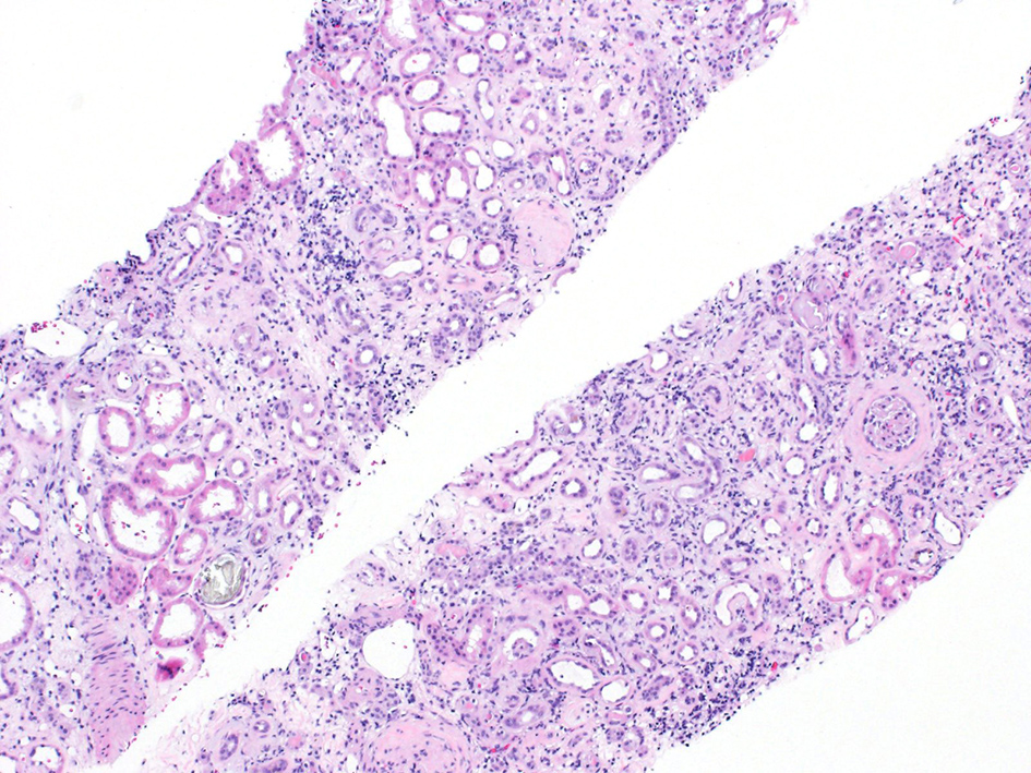 ![]() Click for large image | Figure 4. H&E stain showing interstitial fibrosis and inflammation. H&E: hematoxylin and eosin. |