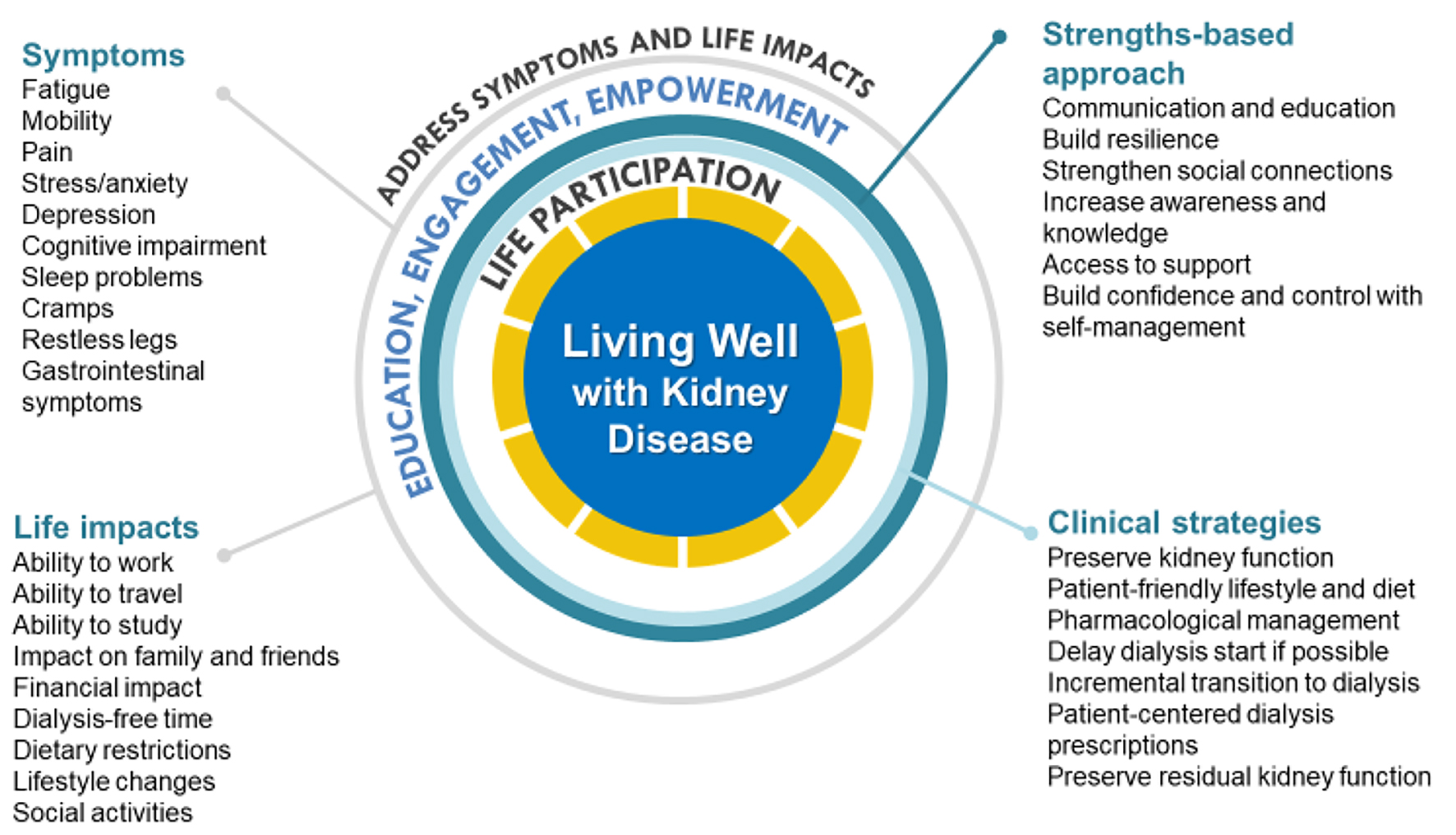 Chronic kidney disease (CKD), its associated symptoms and its treatment, including medications, dietary and fluid restrictions, and kidney replacement therapy can disrupt and constrain daily living, and impair the overall quality of life of patients and their family members. Consequently, this can also impact treatment satisfaction and clinical outcomes [1]. Despite this, the past several decades have seen limited improvement in the quality of life of people with CKD [1]. To advance research, practice and policy, there is increasing recognition of the need to identify and address patient priorities, values and goals [1].