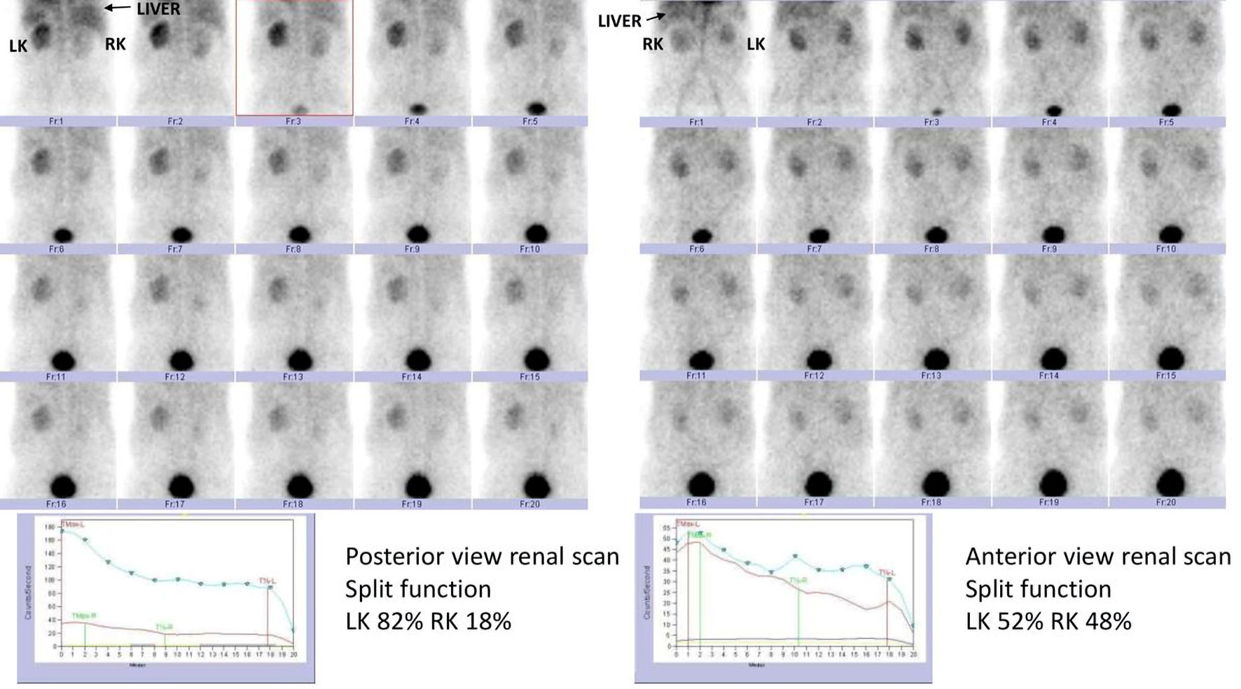 Radionuclide renal scan is a time-tested method to assess split renal function (SRF). It is deciding test prior to donor nephrectomy [1]. SRF is usually calculated by quantifying the radiotracer counts in the two kidneys between 2 and 3 min using computer-generated renogram. Several factors account for variation in split function such as body habitus, location of kidney (patient factor) and placement of region of interest, background subtraction (operator dependent factors), etc. A variation of 2-7% in the same patient on follow-up scan has been reported [2]. Various radionuclides have been used to estimate SRF. These are technetium (Tc)-99m-diethyle triamine penta acetic acid (DTPA), Tc-99m-mercaptoacetyltriglycine (MAG3), Tc-99m-dimercaptosuccinic acid (DMSA). Computed tomography (CT) angiography and dynamic contrast-enhanced magnetic resonance (MR) angiography have also been used to calculate SRF [3, 4]. An 80-year-old male was detected with renal mass on sonography. CT scan revealed an enhancing tumor in the interpolar region of left kidney. Tc-99m-DTPA renal scan showed compromised function of right kidney both qualitatively and quantitatively. The CT scan was reviewed and there was a large cyst in the posterior cortex of right kidney. Hence, the radionuclide scan was repeated in anterior view on another day (within 1 week). The repeat scan showed equal split function of the two kidneys. Thus, it is important to recognize that structural changes may result in misinterpretation of renal scan. Adequate precautions observed prior to imaging may prevent such errors.