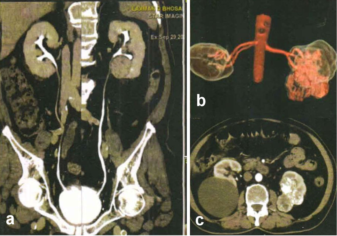 His sonography revealed a mass in lower pole of left kidney. CT showed a solid lobulated lesion at the lower and interpolar cortex of the left kidney with heterogeneous post contrast enhancement suggesting renal neoplasm. An exophytic cortical cyst at interpolar cortex of the right kidney was also noted. His biochemical profile was normal. Serum creatinine was 0.91 mg/dL.