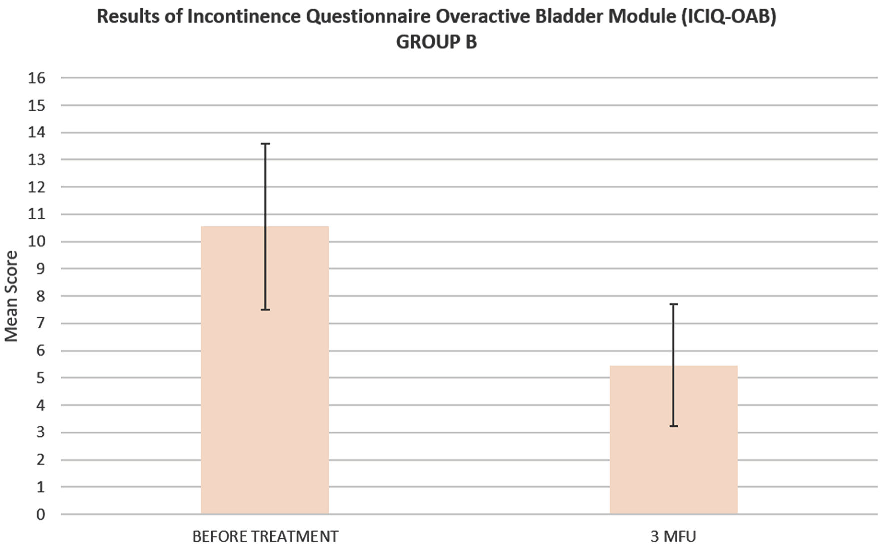 ![]() Click for large image | Figure 2. Histogram representation of ICIQ-OAB mean score of patients suffering from UUI (group B), before the treatment and up to 3 months follow-up. ICIQ-OAB: Incontinence Questionnaire Overactive Bladder Module; UUI: urge urinary incontinence; 3MFU: 3 months follow-up. |