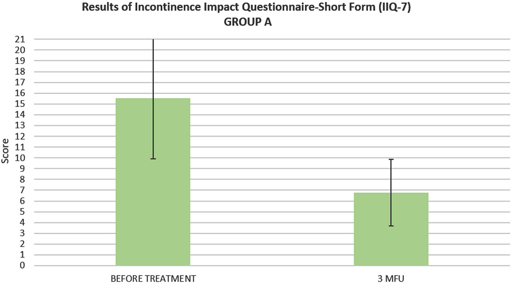 Two questionnaires were used to evaluate the urinary improvements: Incontinence Questionnaire Overactive Bladder Module (ICIQ-OAB) [5] has been assigned and filled out by patients of group B, and Incontinence Impact Questionnaire-Short Form (IIQ-7) [6] has been assigned and filled out by patients of group A. The two questionnaires were completed before each treatment and up to 3 months follow-up (3MFU).