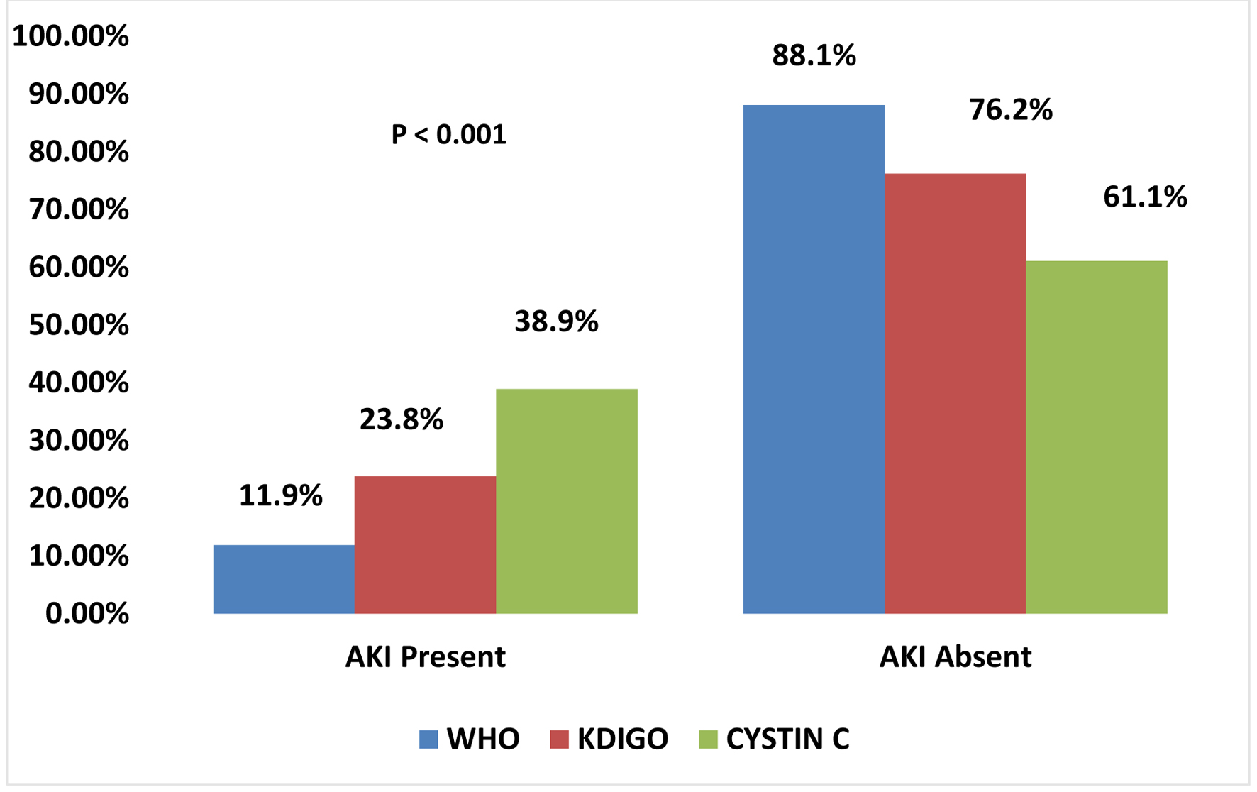 ![]() Click for large image | Figure 2. Bar chart showing the prevalence of AKI using WHO, KDIGO and cystatin C. AKI: acute kidney injury; KDIGO: Kidney Disease: Improving Global Outcomes; WHO: World Health Organization. |