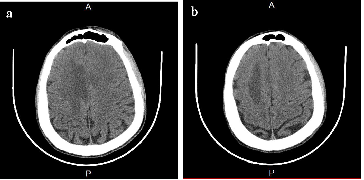 Figure 1. Brain CT. (a) A paramedian right low density area located in the corpus callosum and in the white matter of the right centrum semiovale. (b) A hypodense zone with a discrete mass effect on the right ventricle.