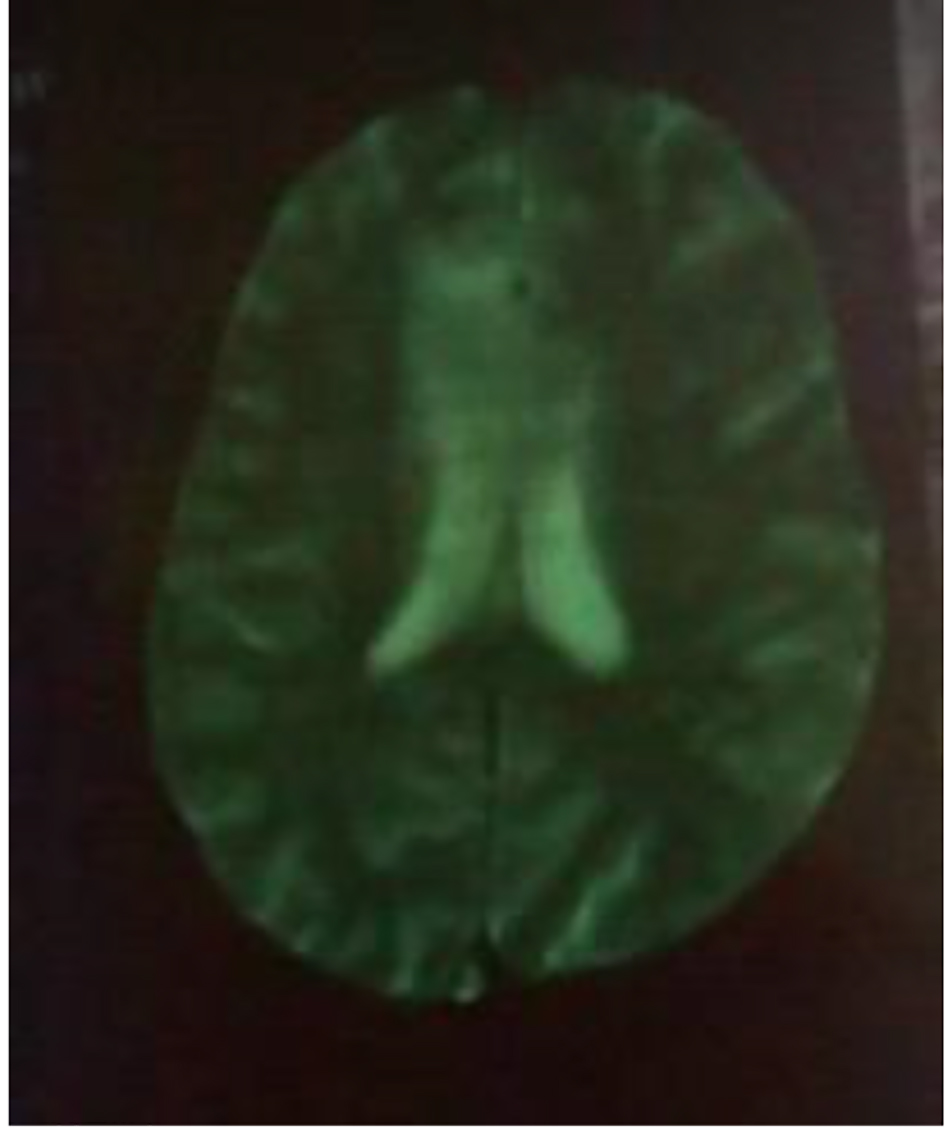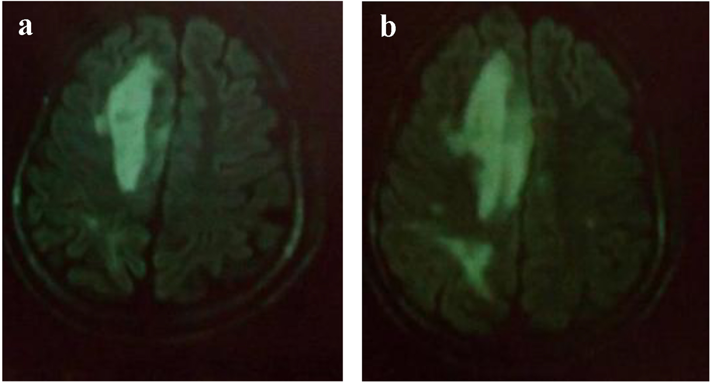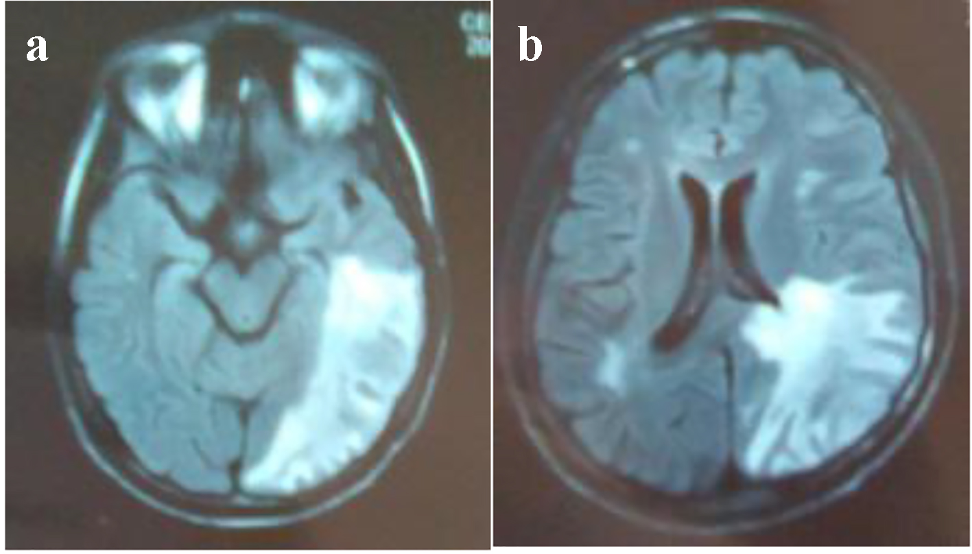 Figure 5. (a, b) MRI: cerebral axial section: hypersignal T2 in parieto-temporo-occipital left area reaching the left corpus callosum lesions.