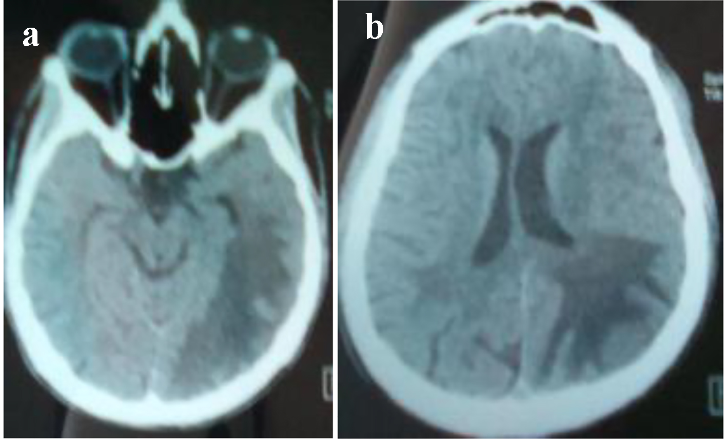 Figure 4. (a, b) Brain CT: hypodensity in left cortico and under cortical parietooccipital area and in the white matter of the right centrum semiovale.