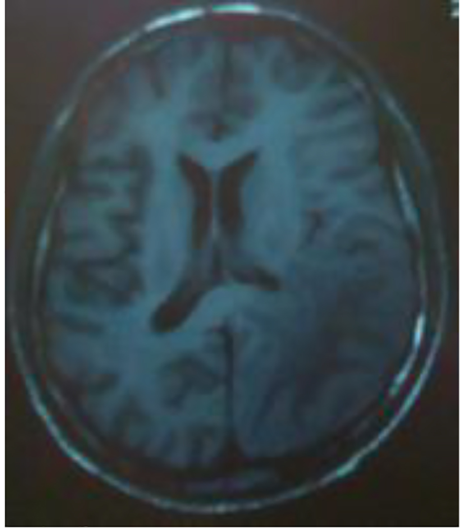 Figure 6. MRI: cerebral axial section: hyposignal T1 in parieto-temporo-occipital left area reaching the left corpus callosum lesions.